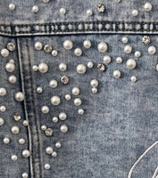 This BEAUTIFUL jean jacket is crafted with heavy duty, high quality denim and then adorned with faux pearls on the front and back that were each individually hand set onto the jacket by expert seamstresses.